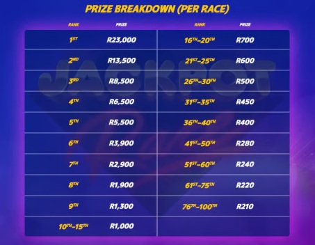 The prize pool is R100,000 in total and it is distributed across the top 100 leaderboard positions. First place secures a massive R23,000 while second place takes home R13,500. Third place is worth R8,500, fourth pays R6,500, and fifth pays R5,500. From there the prizes continue to scale down, with sixth position at R3,900, seventh at R2,900, eighth at R1,900, and ninth at R1,300. Positions ten through fifteen each receive R1,000.
