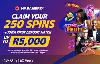 - Bonus spins: 250 spins on selected Habanero slots, no wagering required, maximum win R5,000. Spins valued at R0.15 each and valid for 14 days.